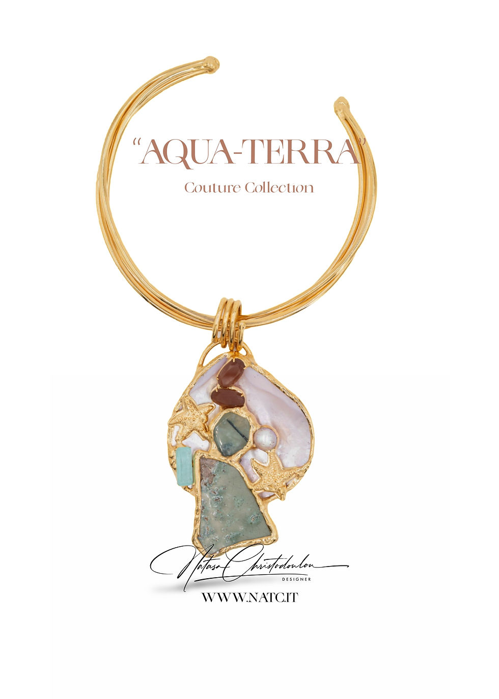 The NATC "Aqua-Terra" Couture Jewelry Collection is a breathtaking fusion of the natural world's duality, seamlessly blending the serenity of water and the strength of earth into a symphony of luxurious craftsmanship. Each piece in the collection is designed to evoke the beauty of flowing rivers, tranquil oceans, rugged landscapes, and unyielding terrains, creating a harmonious balance between fluidity and solidity. Organic designs reflecting rippling waves, cascading waterfalls, and rugged stone textures. Earthy hues complemented by oceanic blues, greens, and iridescent whites. Exquisite Materials Rare gemstones like aquamarine, emerald, turquoise, and opal symbolize water's fluidity. Earthy elements like smoky quartz, diamonds, and gold mimic terrestrial strength. Incorporates sustainable sourcing, reflecting a commitment to preserving the environment that inspires the collection. Artisan Craftsmanship Intricate settings and bold silhouettes emphasize the interplay of soft curves and angular edges. Handcrafted details celebrate the uniqueness of every piece, making each one a wearable work of art. Versatile Elegance Suitable for both red carpet glamour and intimate soirées. Statement necklaces, refined earrings, layered bracelets, and striking rings designed to empower and enchant. The NATC "Aqua Terra" collection is more than just jewelry—it’s an ode to the planet's enduring beauty, inviting wearers to carry the essence of water and earth wherever they go. Perfect for those who appreciate artistry, sustainability, and the timeless allure of nature.