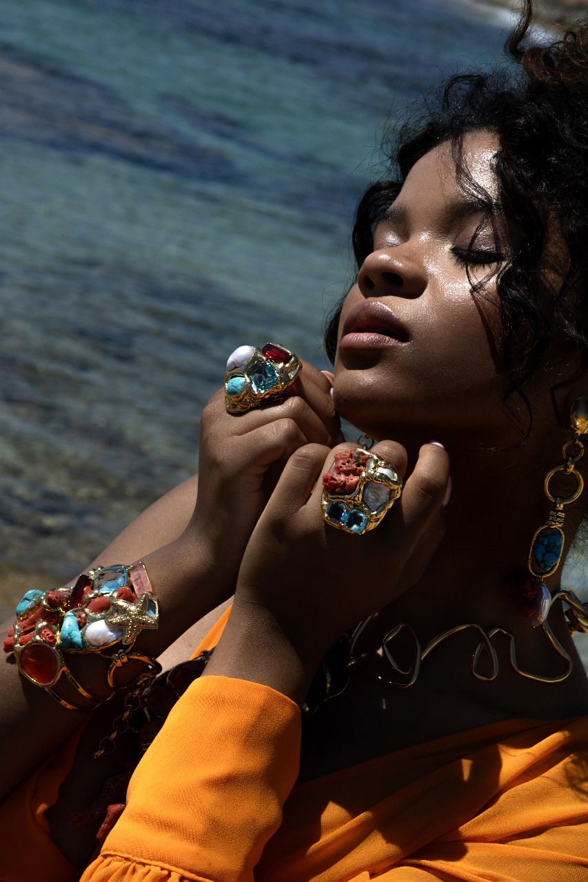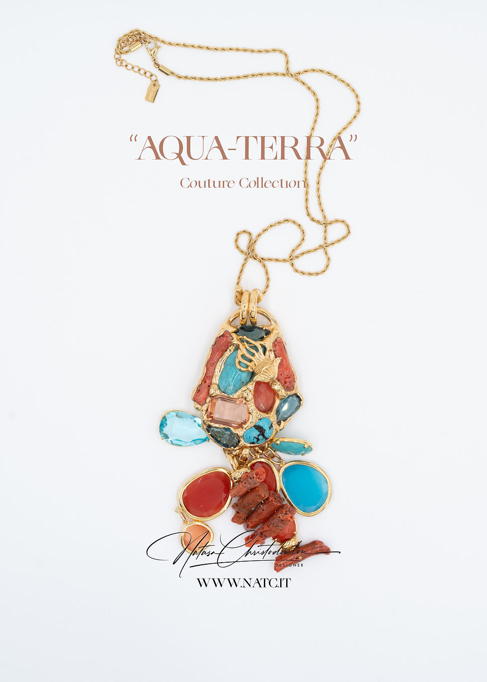 The NATC "Aqua-Terra" Couture Jewelry Collection is a breathtaking fusion of the natural world's duality, seamlessly blending the serenity of water and the strength of earth into a symphony of luxurious craftsmanship. Each piece in the collection is designed to evoke the beauty of flowing rivers, tranquil oceans, rugged landscapes, and unyielding terrains, creating a harmonious balance between fluidity and solidity. Organic designs reflecting rippling waves, cascading waterfalls, and rugged stone textures. Earthy hues complemented by oceanic blues, greens, and iridescent whites. Exquisite Materials Rare gemstones like aquamarine, emerald, turquoise, and opal symbolize water's fluidity. Earthy elements like smoky quartz, diamonds, and gold mimic terrestrial strength. Incorporates sustainable sourcing, reflecting a commitment to preserving the environment that inspires the collection. Artisan Craftsmanship Intricate settings and bold silhouettes emphasize the interplay of soft curves and angular edges. Handcrafted details celebrate the uniqueness of every piece, making each one a wearable work of art. Versatile Elegance Suitable for both red carpet glamour and intimate soirées. Statement necklaces, refined earrings, layered bracelets, and striking rings designed to empower and enchant. The NATC "Aqua Terra" collection is more than just jewelry—it’s an ode to the planet's enduring beauty, inviting wearers to carry the essence of water and earth wherever they go. Perfect for those who appreciate artistry, sustainability, and the timeless allure of nature.